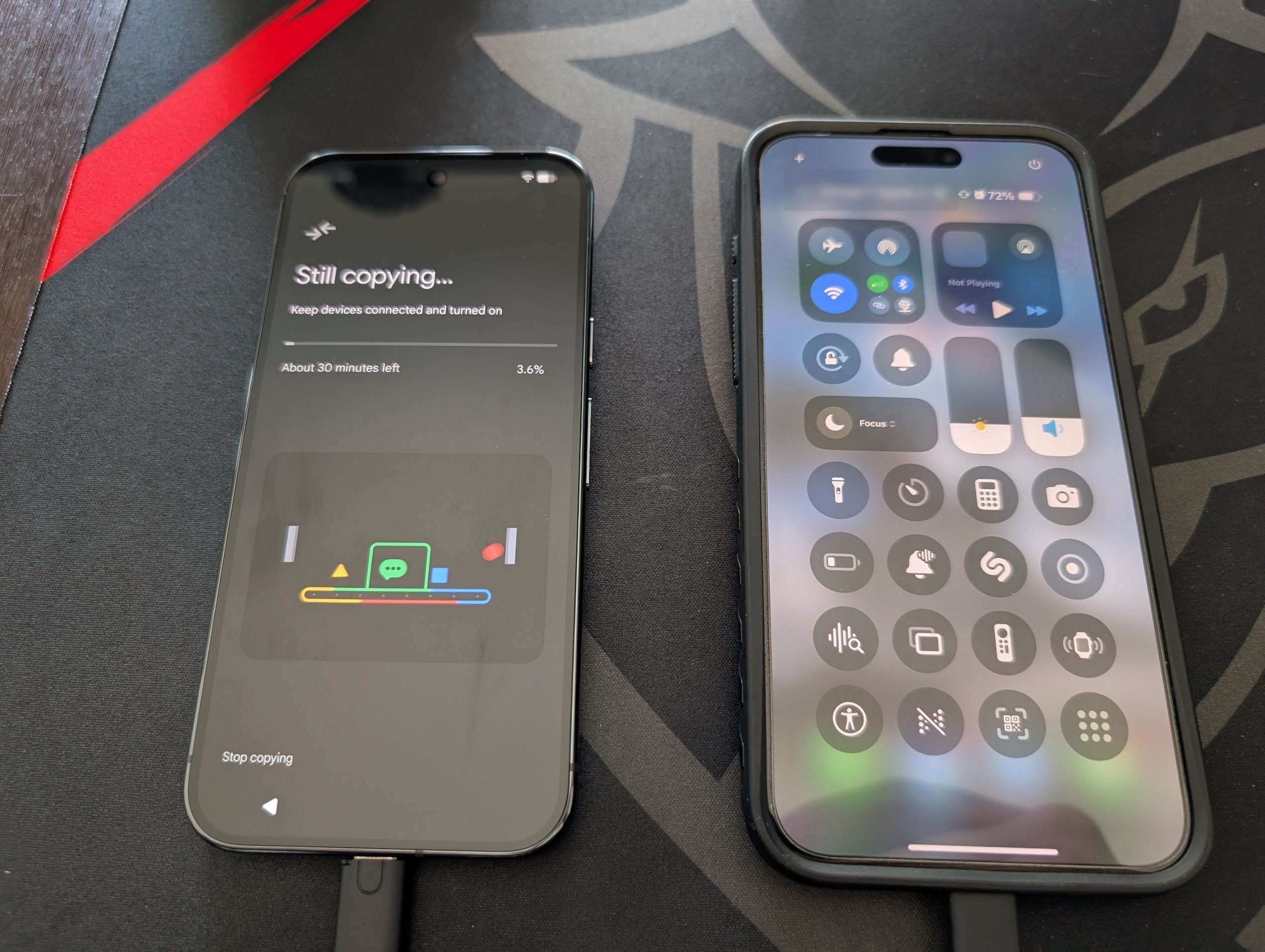 ⬆️📷 A (pretty blurry) picture. On the left, the Pixel 10 Pro, on the right, the iPhone 15 Pro Max.